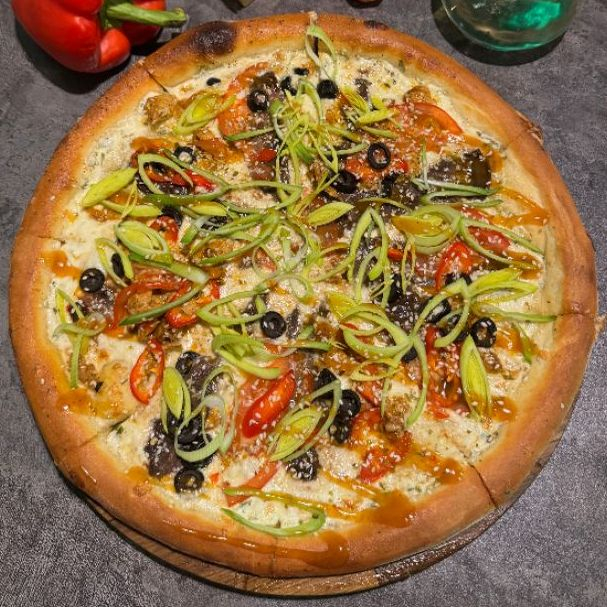 Соус Белый, сыр Моцарелла, помидор, чили, лук-порей, мясо говядины (вырезка), филе курицы, маслины, кунжут.