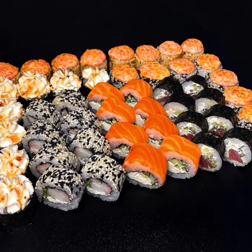 Ролл Филадельфия с огурцом 1/2, ролл Филадельфия Эби 1/2, ролл Магура Black, ролл Чили Краб, ролл темпура мидии.