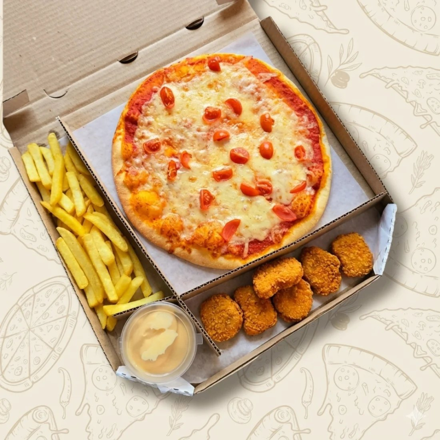 Пицца Фирменная (300г), наггетсы (6шт), картофель фри (100г), соус сырный.