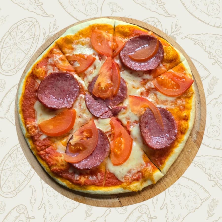 Охотничьи колбаски, маринованные огурчики, томатная паста, моцарелла.