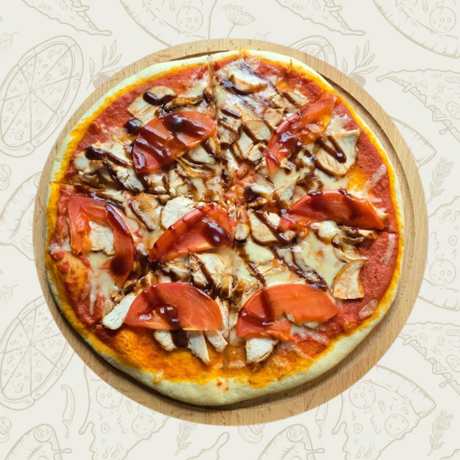 Нежная курочка, моцареллла, помидор, соус барбекю.