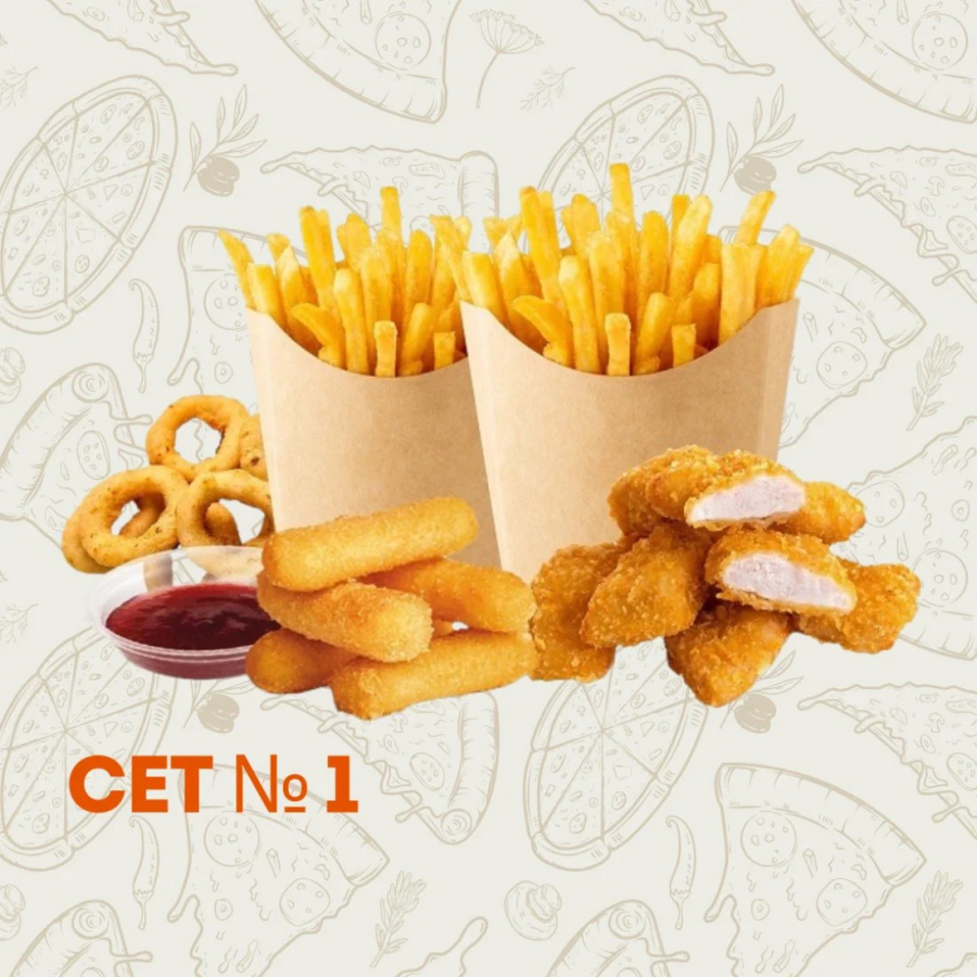 Фри, наггетсы, сырные палочки + два соуса.