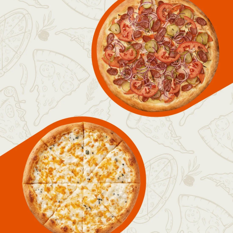 Две пиццы: Пицца 4 сыра - все самые вкусные сыры разных сортов (фета, моцарелла, Blue Cheese и пармезан), пицца Мюнхен - ветчина с охотничьими колбасками, луком, консервированными огурчиками и сыром Моцарелла.
