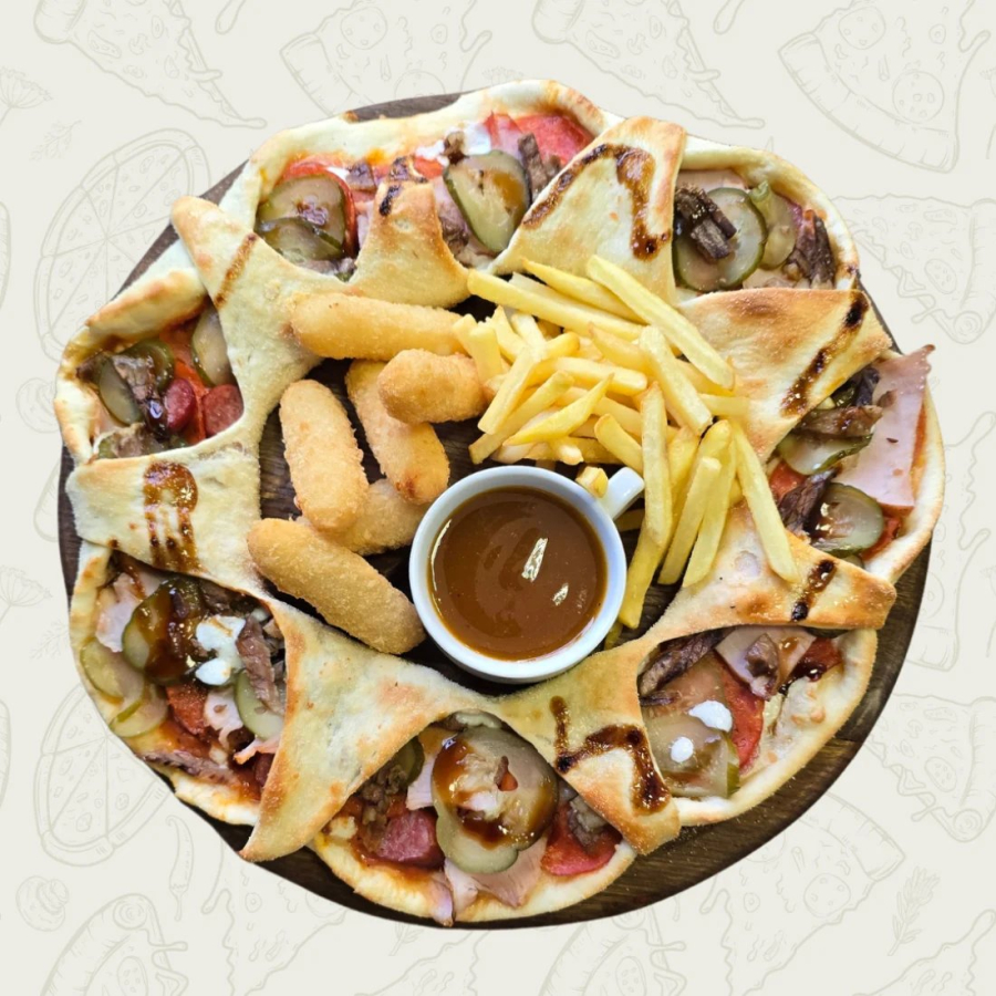Ветчина, говядина маринованная, пепперони, охотничьи колбаски, маринованные огурцы, чесночный соус + сырные палочки, картофель фри.