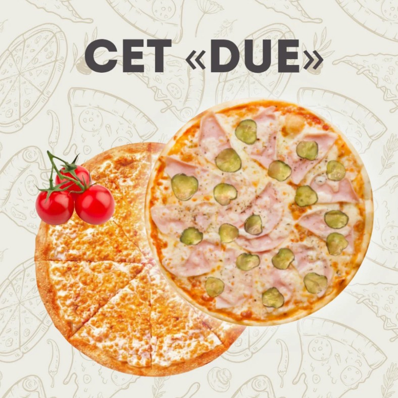 Две пиццы: Пицца 4 сыра - все самые вкусные сыры разных сортов (фета, моцарелла, Blue Cheese и пармезан), пицца Мюнхен - ветчина с охотничьими колбасками, луком, консервированными огурчиками и сыром Моцарелла.