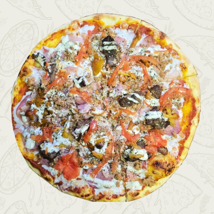 Сыр, ветчина, говядина, свиной фарш, маринованные опята, помидор, сырный соус, чесночный соус.
