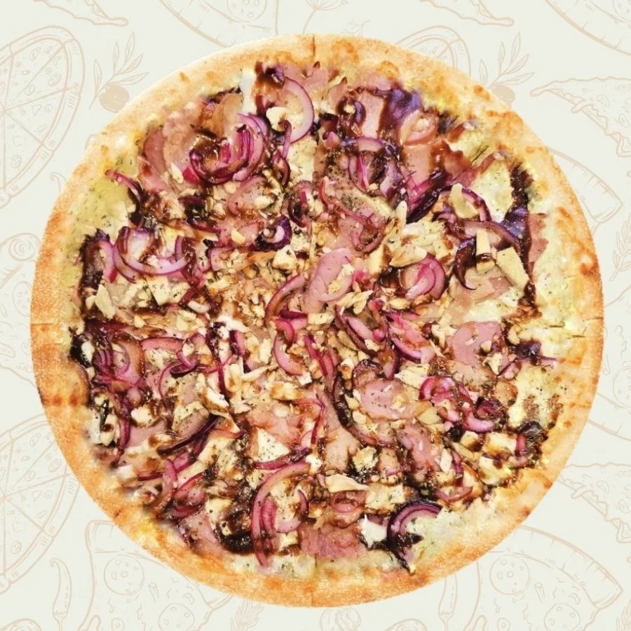 Маринованное куриное филе, ветчина, бекон, красный лук, сыр моцарелла, соус барбекю, фирменный белый соус.
