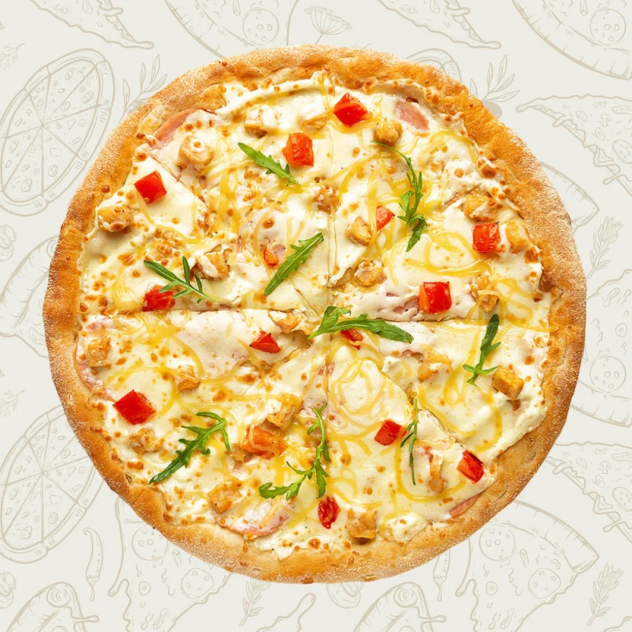 Маринованное куриное филе, ветчина, бекон, красный лук, сыр моцарелла, соус барбекю, фирменный белый соус.