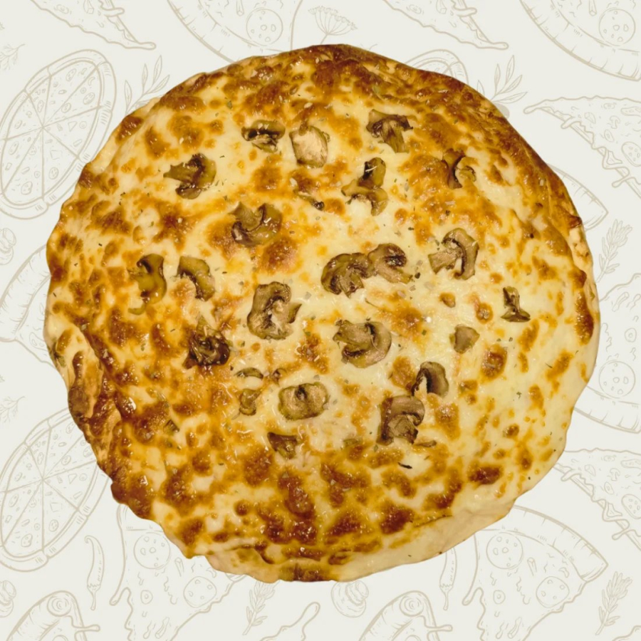 Грибы, ветчина, помидоры, перец, сулугуни, чеддер, соус и прованские травы.