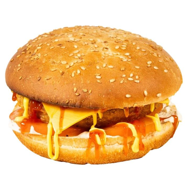 Заказать Булка, куриная котлета, соус чесночный, сыр Чеддер, кетчуп, помидор.