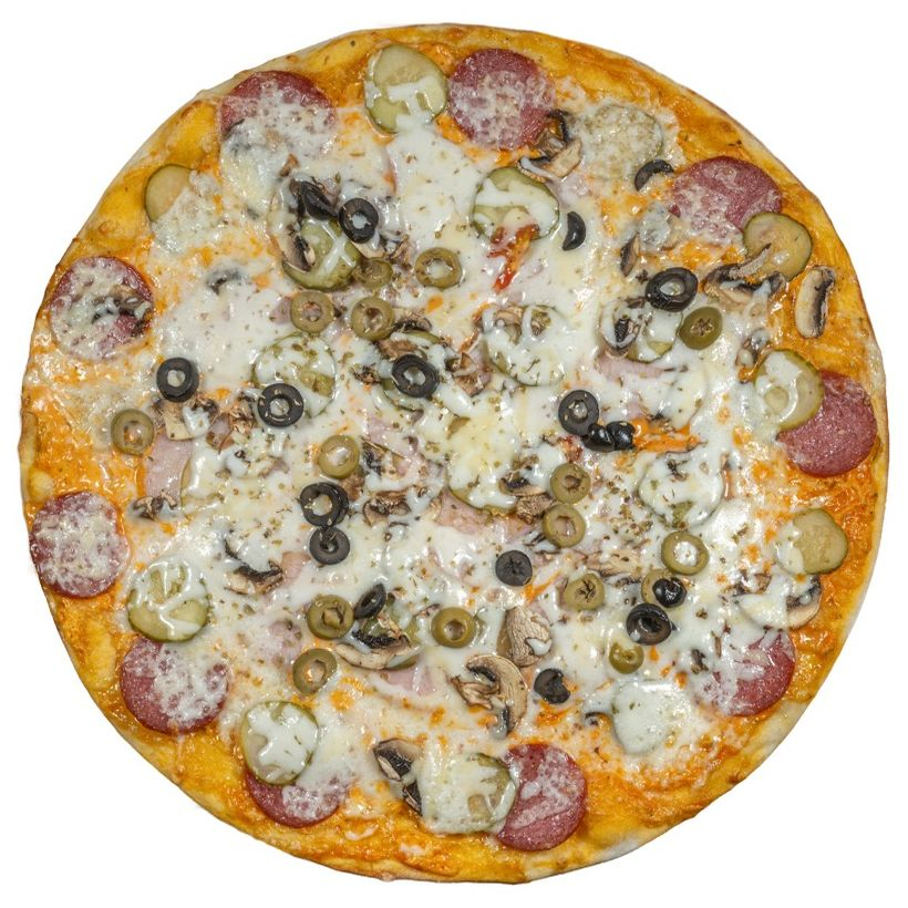 Заказать Тесто, чесночный соус, салями, ветчина, грибы, соленый огурец, сыр, оливки - маслины, орегано.