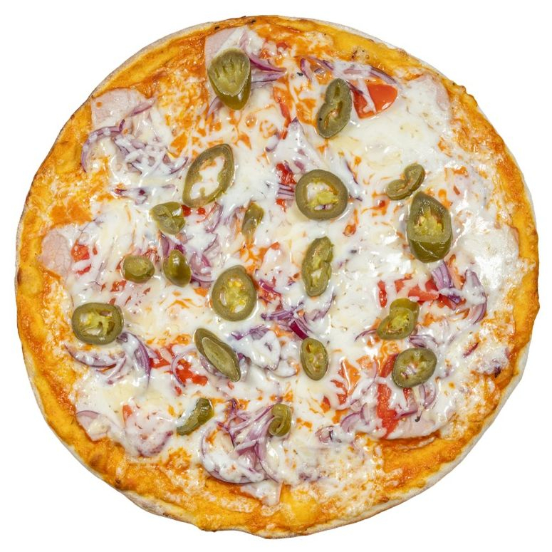 Заказать Тесто, острый соус, чесночный соус, ветчина, лук маринованный, помидор, перец халапеньо, орегано.