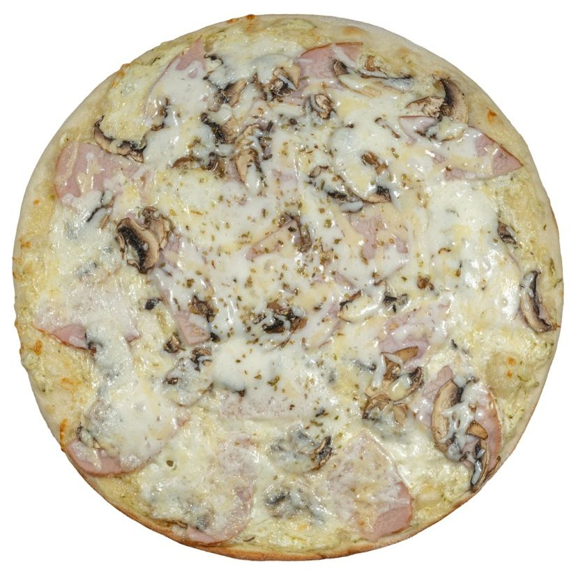 Тесто, чесночный соус, ветчина, сыр, орегано.