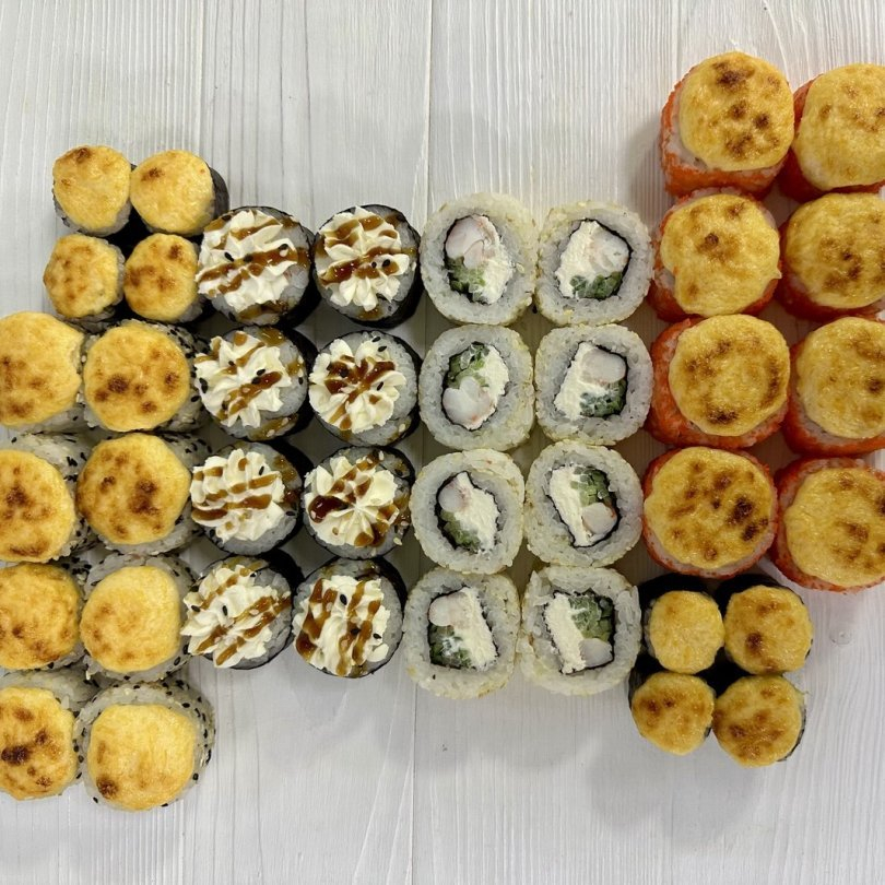 Филадельфия 8 шт, калифорния 8 шт, фьюжн 8 шт, сезам запеченный 8 шт, запеченная классика с мидией 8 шт, чикен хот 8 шт.