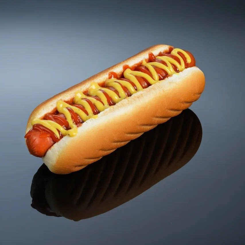 Булка, сосиска, сыр, кетчуп, горчица , лук жареный.
