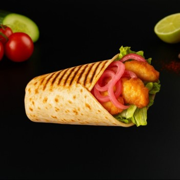 Тортилья, капуста, огурец, помидор, лук маринованный, наггетсы куриные, соус чесночный.