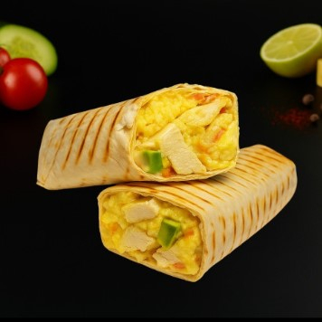 Лаваш тандырный, мясо курицы-гриль, соус цезарь, сыр, огурец, помидор, картофель фри или дольки.
