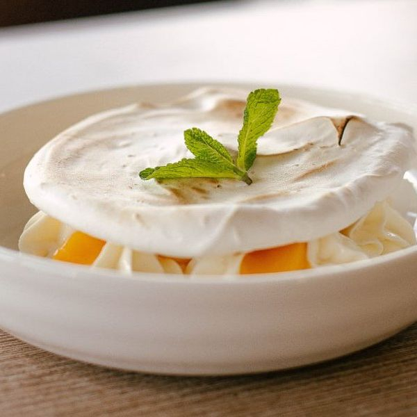Фрукты с хрустящим безе и кремом на основе сыра маскарпоне и сливок.