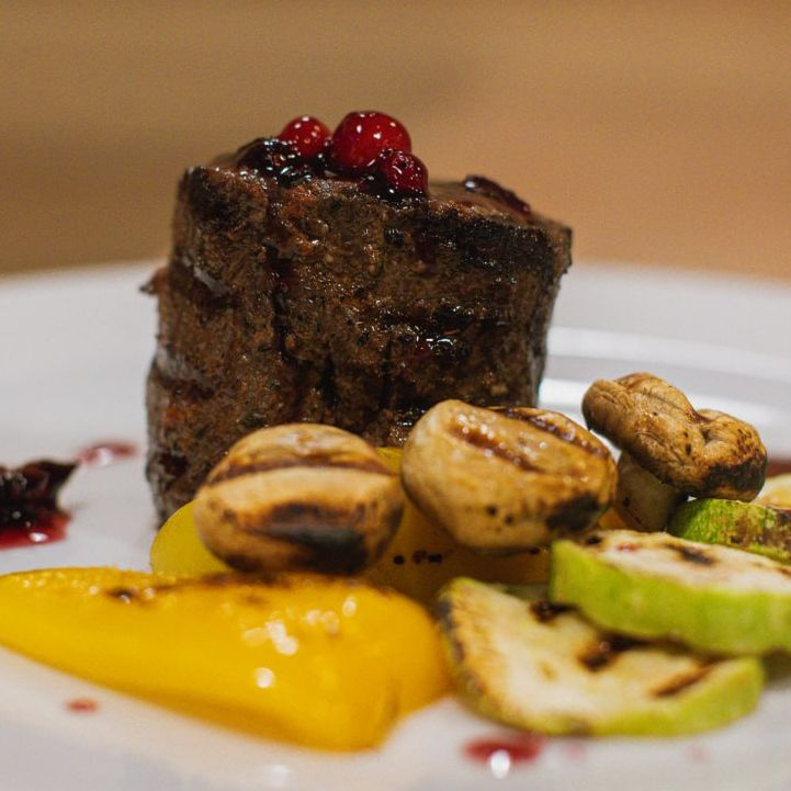 Говядина, овощи гриль и соус на основе красного вина и клюквы.