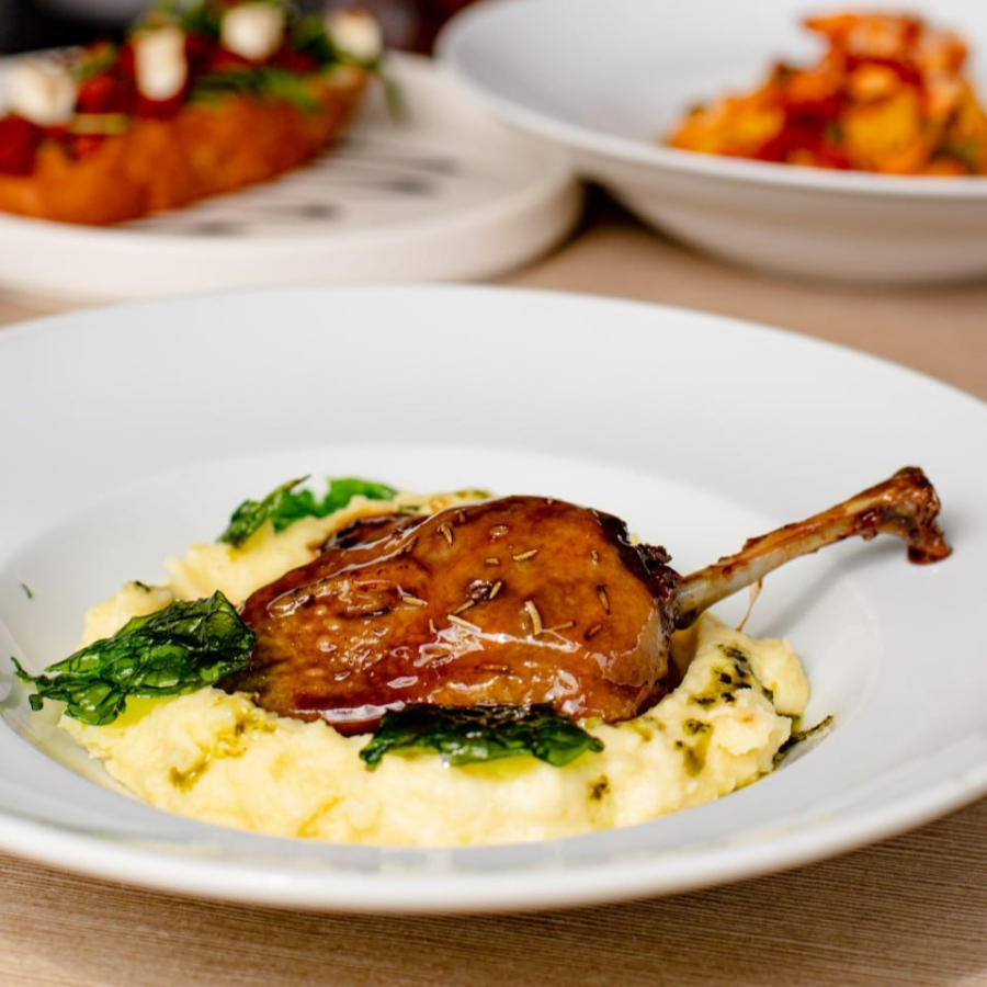 Утиная ножка в глазури на основе коньяка, меда и соевого соуса, картофельное пюре, шпинат, соус песто.