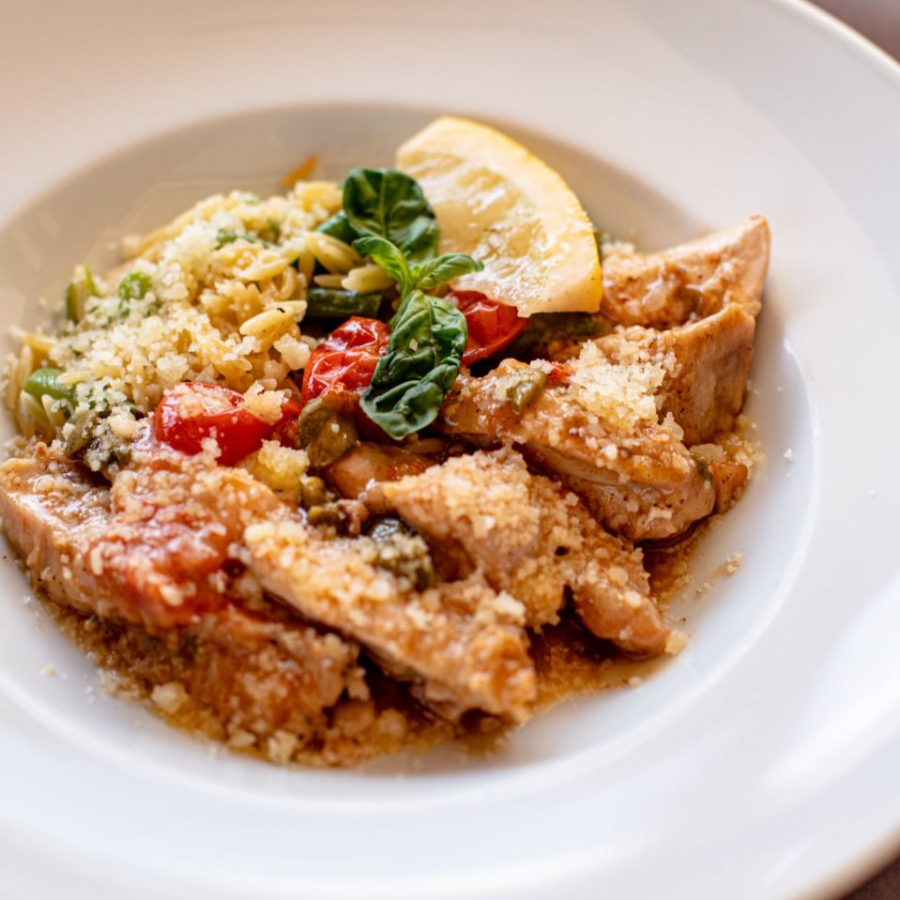 Мякоть бедра в соусе из лимона, томатов черри и каперсов, ризони со стручковой фасолью, сыр твердый, чесночное масло.