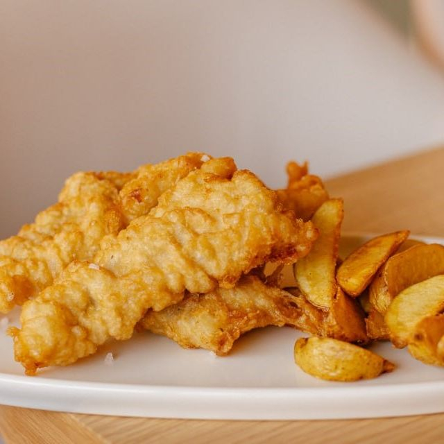 Филе белой рыбы, тесто-кляр, картофельные дольки.