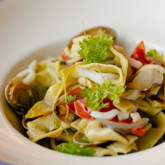 Паста фреска, кальмар, вонголе, томаты, вино белое.