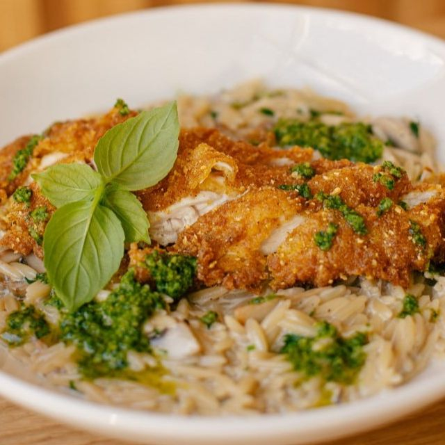 Филе цыплёнка, панировка, орзо, шампиньоны, сливки, соус песто.