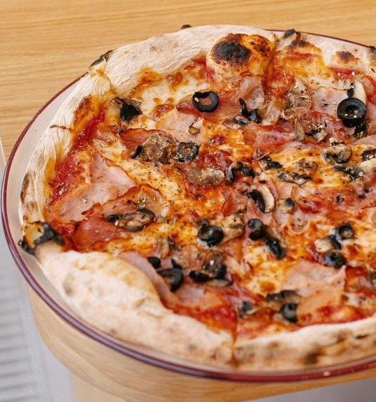 Свинина сыровяленая, ветчина, шампиньоны, маслины, сыр моцарелла, соус томатный.