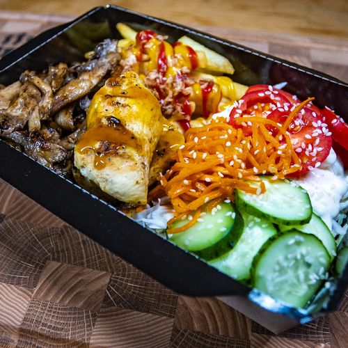 Заказать Свиная шея, картофель фри, вешенки, капуста, огурец свежий, помидор свежий, морковь, семечки кунжута, жареный лук, фирменный соус, томатный соус, муштарда, устричный соус.