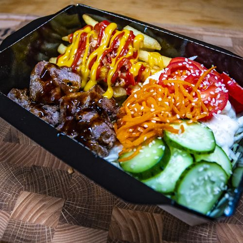 Заказать Свиная шея, картофель фри, вешенки, капуста, огурец свежий, помидор свежий, морковь, семечки кунжута, жареный лук, фирменный соус, томатный соус, муштарда, устричный соус.