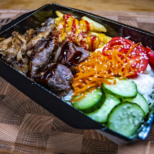 Заказать Свиная шея, картофель фри, вешенки, капуста, огурец свежий, помидор свежий, морковь, семечки кунжута, жареный лук, фирменный соус, томатный соус, муштарда, устричный соус.