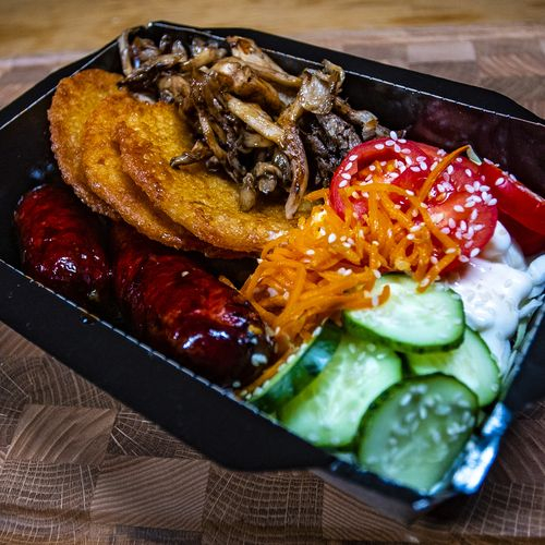 Бокс с запеченной колбасой, драниками и грибами