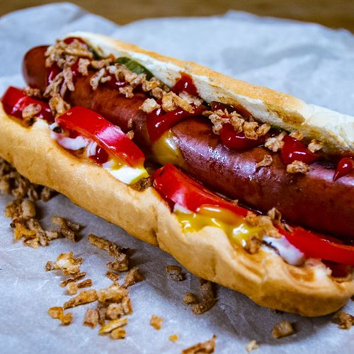 Заказать Булочка для хот-дога, свиная колбаска, морковь, помидор свежий, огурец маринованный, маринованный лук, фирменный соус, томатный соус, горчичный соус, жареный лук.
