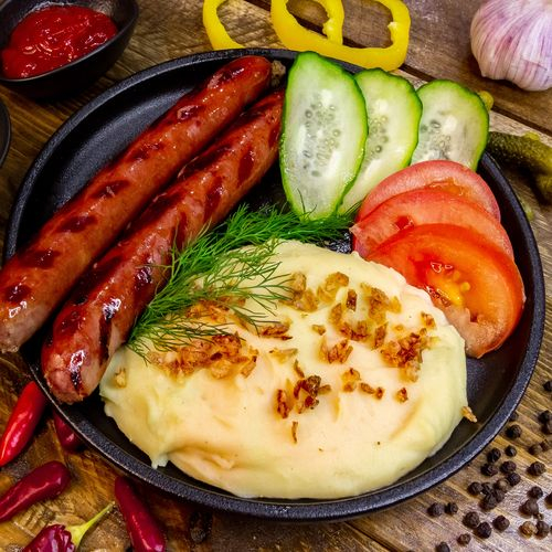 Картофель, молоко, колбаски, свежий огурец, свежий помидор, морковь, лук, семечки кунжута.