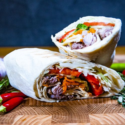 Заказать Лаваш армянский, свиная шея, капуста, огурец свежий, огурец маринованный, морковь, фирменный соус, корейский соус.