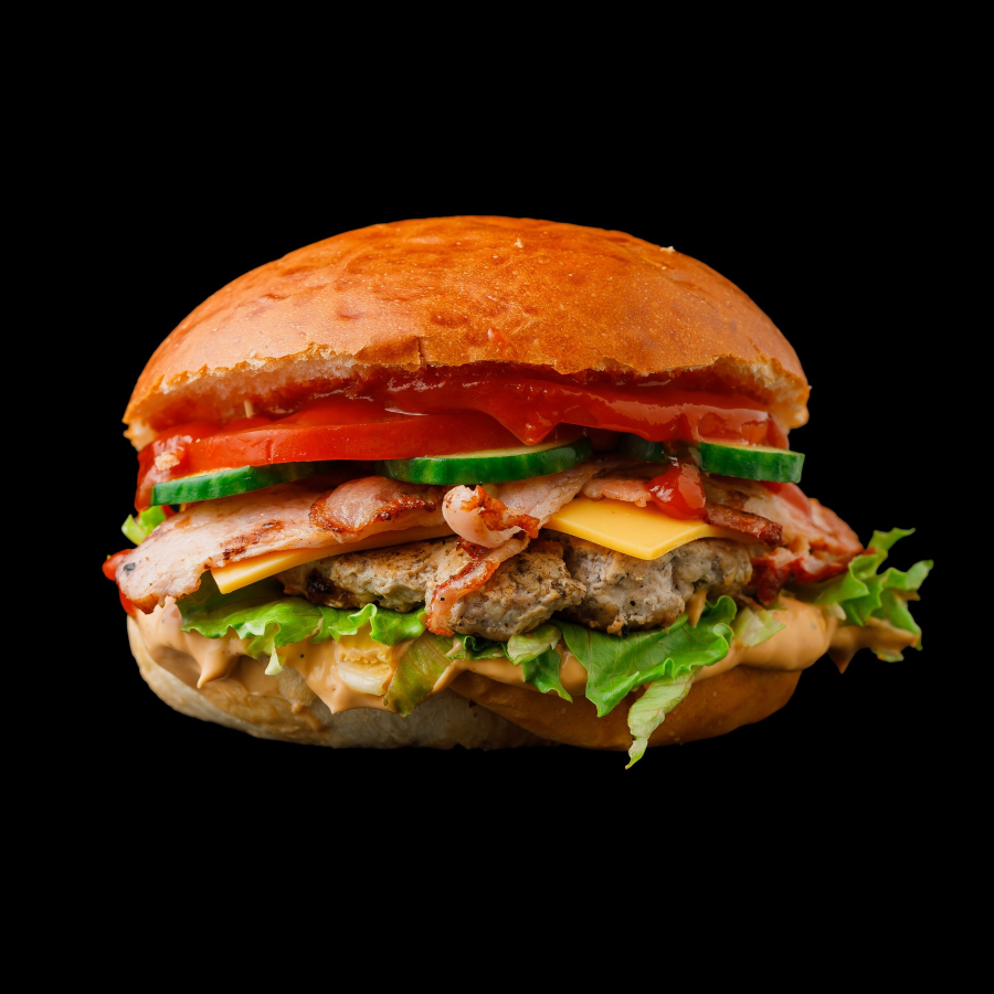 Булочка из печи, сочная котлета из свинины, ломтик сыра Чеддер, свежий салат Айсберг, жареный бекон, томаты свежие, огурец свежий, лук жареный, фирменный соус Гриль, фирменный соус Барбекю.