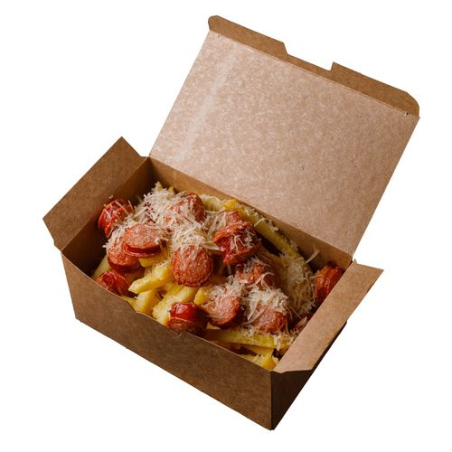Хрустящий картофель фри, колбаски полукопченые, сыр Пармезан.