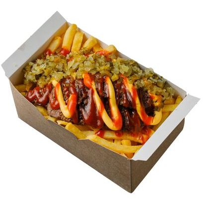 Сочная говядина, хрустящий картофель фри, соус Сырный, фирменный соус Барбекю, перец халапенью, маринованные огурчики.