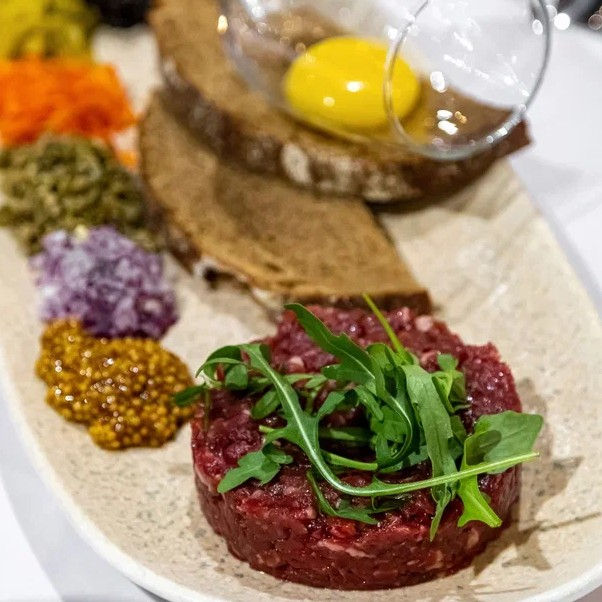 Заказать Говяжья вырезка, красный лук, болгарский перец, маслины, маринованный огурец, французская горчица, каперсы, фирменная заправка, хлеб, яичный желток.