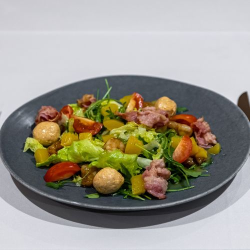 Заказать Панчетта, креветки, черри, фета, персик, микс салата, фирменная заправка.