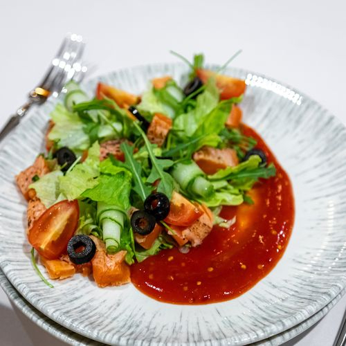 Заказать Микс-салата, лосось, черри, огурец, маслины, пряная заправка.