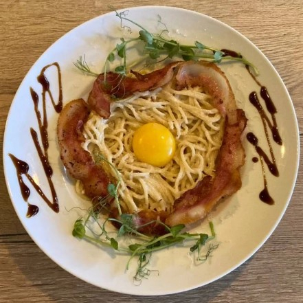 Заказать Макароны из м/к в/с, бекон, сливки 20% жирности, сыр пармезан, желток.