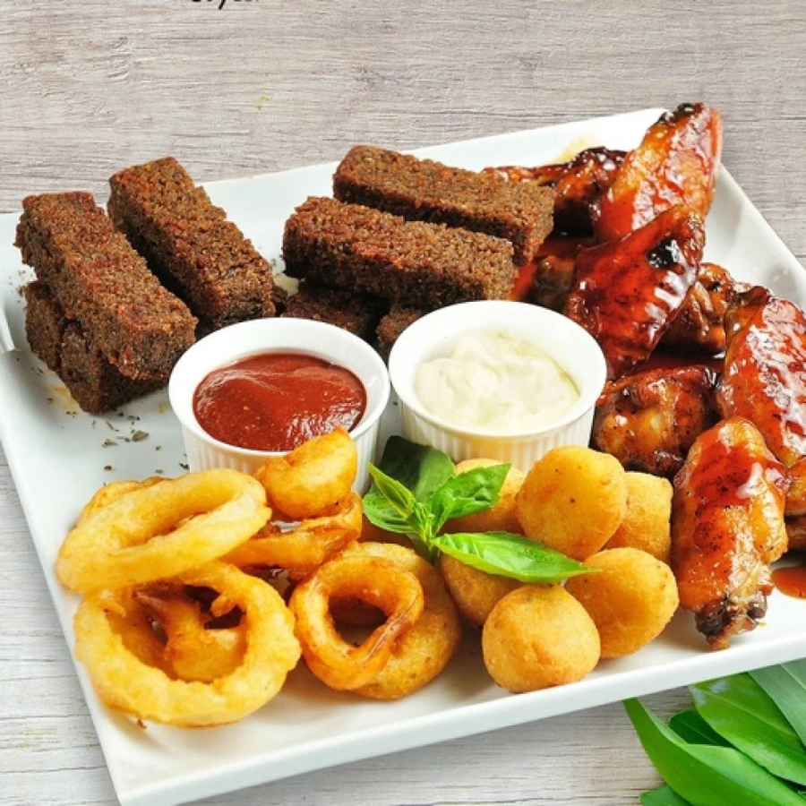 Заказать Луковые кольца, чесночные гренки, кольца кальмара, куриные крылья, соус барбекю.