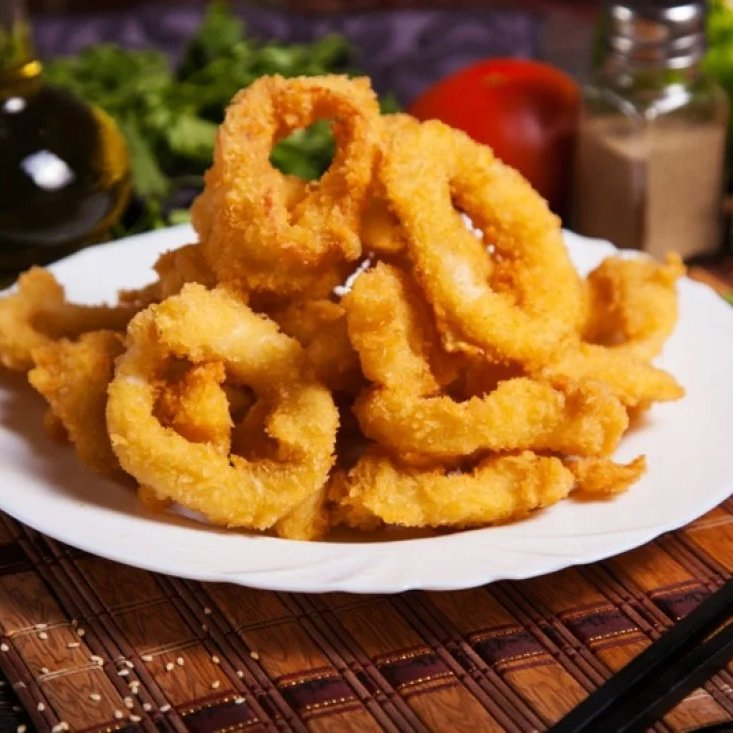Луковые кольца, чесночные гренки, кольца кальмара, куриные крылья, соус барбекю.