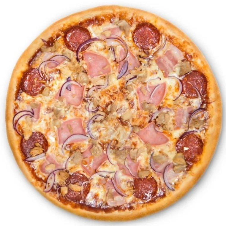 Копченая грудинка, сырокопченая колбаса, лук, перец болгарский, сыр чеддер, чесночное масло, орегано, моцарелла, соус.