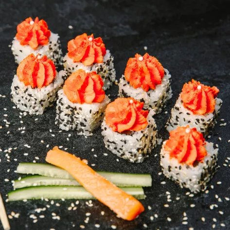 Сливочный сыр, крабовое мясо, огурец, кунжутный соус.