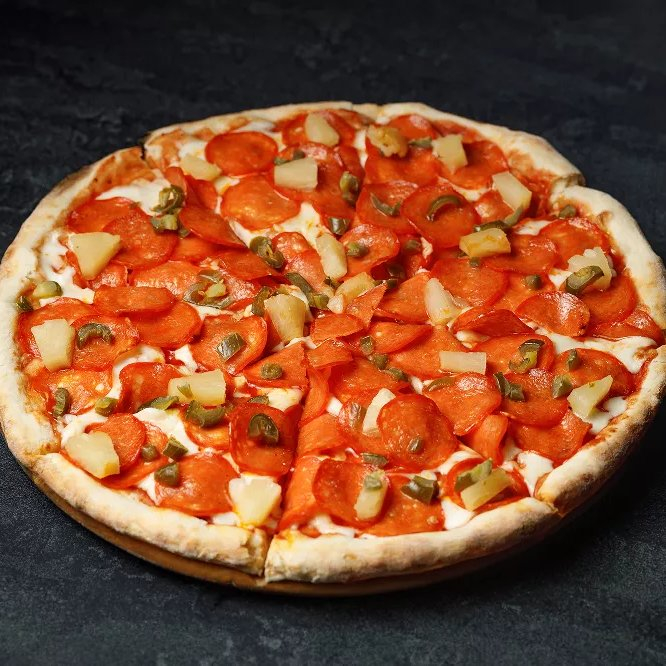 Сыр моцарелла, колбаски чоризо, ананас в сиропе и халапеньо.
