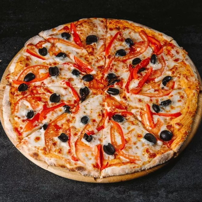 Сыр моцарелла, перец болгарский, томаты и маслины.