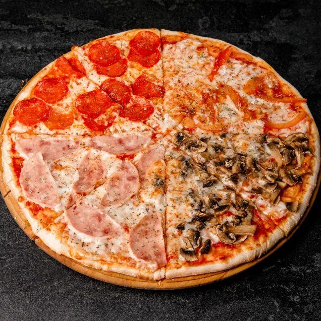 Сыр моцарелла, ветчина, салями, томаты, острый перец халапеньо.